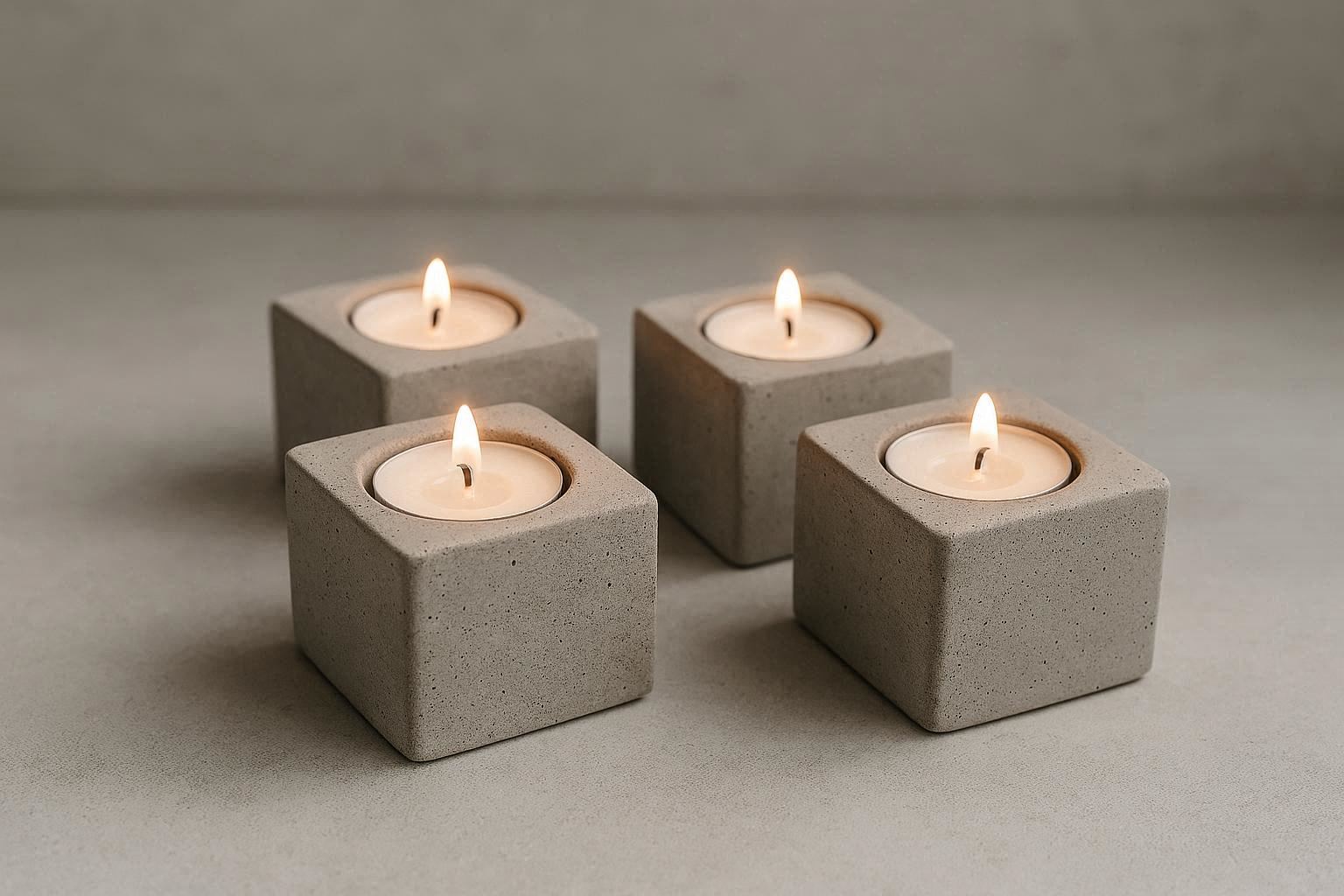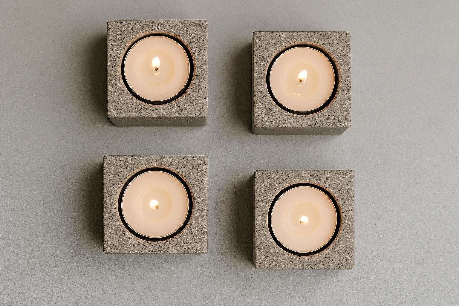 This cohesive set includes four identical, miniature cubic or spherical candle holders, each cast from micro-concrete or cement blend. Measuring approximately 1.5 to 2 inches in each dimension, they are small, weighty, and perfectly formed. Each has a small, centered cavity on top to snugly fit a standard tea light. The matte, grey concrete finish provides a uniform, modern texture across the set.